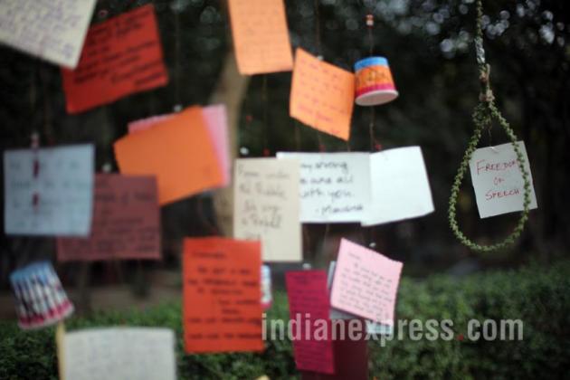 Students read the postcards hung near the Administration block on Sunday (February 28). (Source: Express Photo by Oinam Anand)