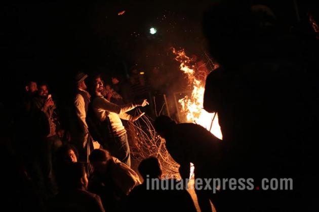 Students of JNU keep warm during their overnight vigil and watch during their protest where Umar Khalid and other students accused of sedition were seen on campus and were taking part in the vigil where they were protected by other students over news that the Police was going to make arrests of them on Sunday night on the campus in New Delhi (February 21). (Source: Express Photo by Tashi Tobgyal)