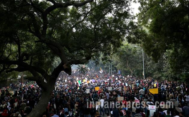 JNU students taking part in a protest against arrest of JNUSU president Kanhaiya Kumar at Jantar Mantar in New Delhi on February 18. (Source: Express photo by Ravi Kanojia)