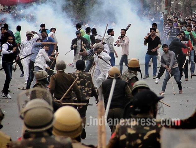 Violence exploded in Rohtak as Jat protesters demanding reservation in jobs and education. Also set fire to a minister's home, damaged property and burnt police vehicles. Mobs blocked highways and rail tracks on February 19. (Source: Express Photo by Gajendra Yadav)