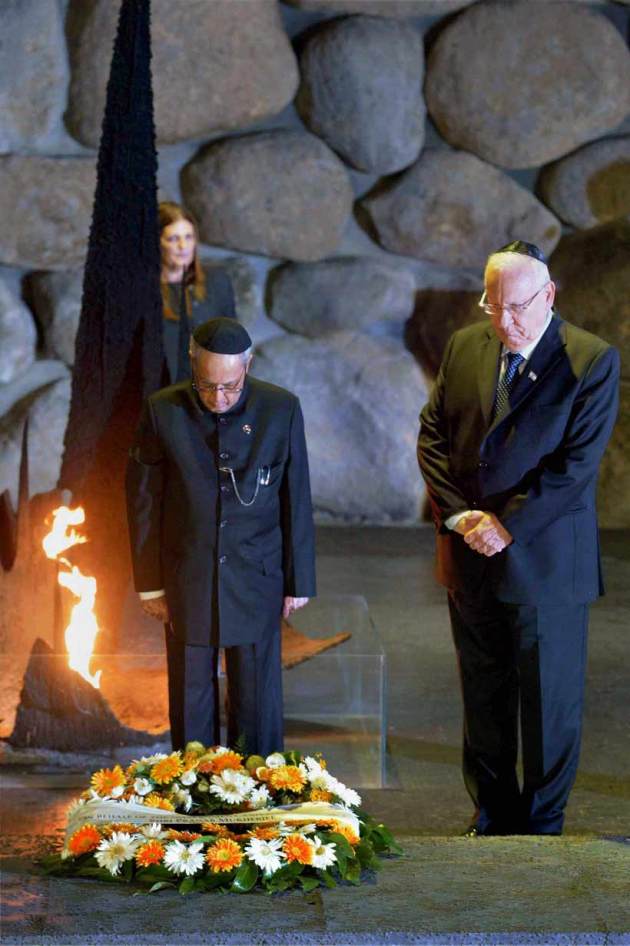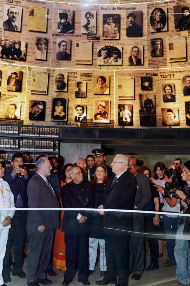President Pranab Mukherjee during his visit to Yad Vashem Hall of Names, Mount Herzl, Jerusalem in Israel on Tuesday (October 13).