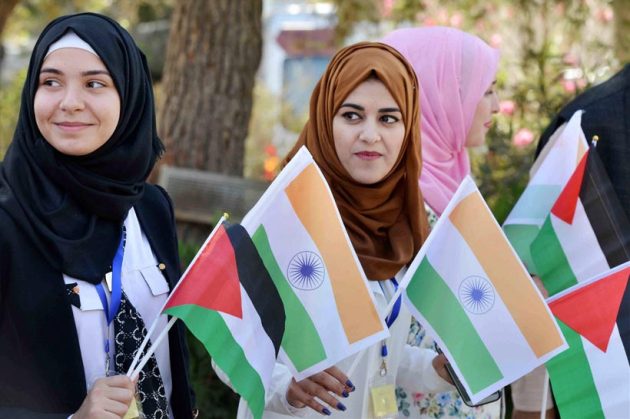 Students welcome President Pranab Mukherjee during the inauguration of India Palestine Centre for Excellence in ICT at Al-Quds University, Abu Dees, in Palestine on Tuesday (Ocotber 13).