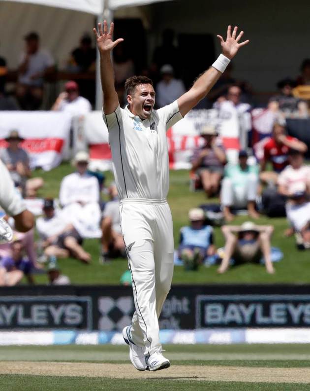 Tim Southee appeals successfully for the wicket of England's Sam Curran on Day 2 (Source: AP)
