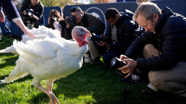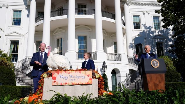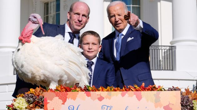 President Joe Biden participated in a lighthearted tradition at the White House, pardoning the national Thanksgiving turkey, Peach, on the South Lawn. He was joined by John Zimmerman, chair of the National Turkey Federation, and his son Grant Zimmerman . (AP)