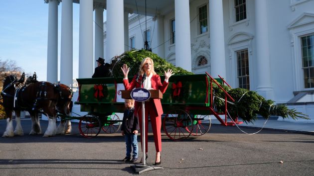 First lady Jill Biden receives the official 2024 White House Christmas Tree on the North Portico of the White House in Washington, Monday, Nov. 25, 2024, as her grandson, Beau Biden, Jr., stands by. Cartner's Christmas Tree Farm from Newland, N.C., provided the Fraser fir that will be displayed in the Blue Room of the White House. (AP)