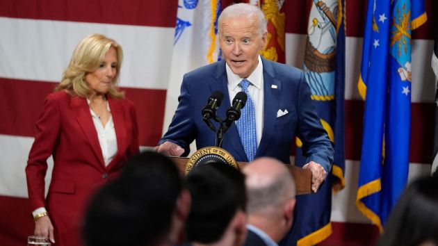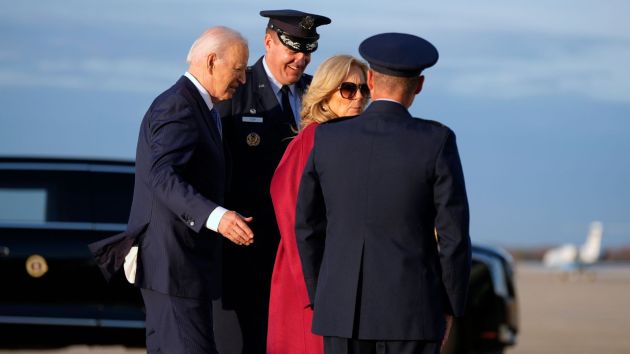 President Joe Biden, left, and first lady Jill Biden, second right, greet members of the military as they arrive to board Air Force One at Joint Base Andrews, Md. (AP)