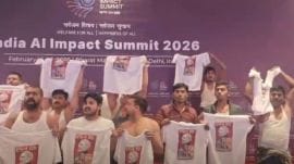 The four protestors went “shirtless” at the Bharat Mandapam during the AI Impact Summit....