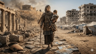 👁 A woman with a child in her arms walks through a war-torn landscape. (Generated using AI) From Troy to Kabul, how women ultimately pay the cost of war