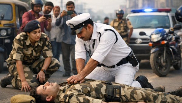 The footage shows the constable quickly stepping in to perform chest compressions on the unconscious man. Within moments, the jawan regained consciousness.