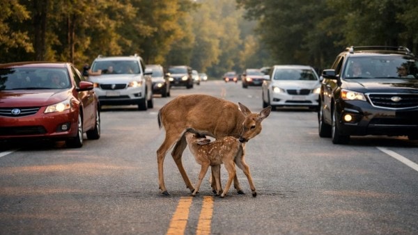 In a video that has now gone viral, the deer is seen gently feeding her calf right in the middle of the road, appearing completely relaxed despite the presence of vehicles and people nearby.