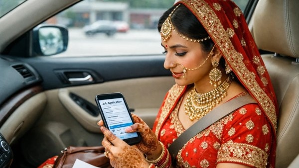 In the viral video, the bride is seen seated inside a car, dressed in her full traditional bridal ensemble, quietly focused on her phone and sending an email for a job opportunity.