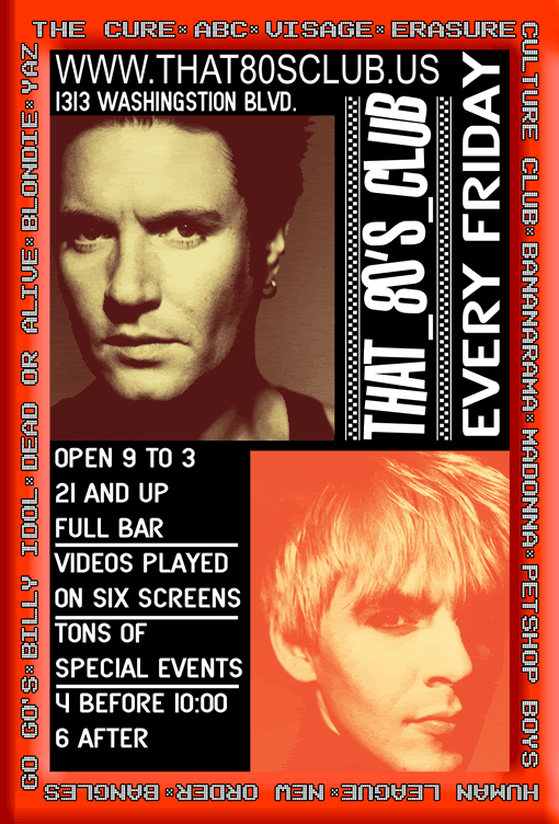 rhodesy and I have been going to this FABULOUS club in Downtown every Friday night and having a blast! It's so much fun we can't wait for Friday each week!! The music is great and they have six video screens so you can watch videos and dance at the same time. The DJ's are friendly and play great music all night long. Oh, and Jeff, one of the bartenders, makes an AMAZING chocolate martini. So if you're looking for a fun night out on Friday, can get a babysitter, and love 80's music, check out That 80's Club.