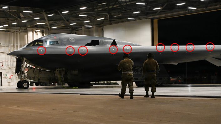According to another theory, the patches would be formation lights, those low-intensity, thin-film electroluminescent strips or LEDs installed on most combat aircraft to facilitate safe formation flying at night or in low visibility. Such fighter-like visible formation-light setup used on tactical jets have never been used (and possibly needed) by the B-2s, since the aircraft’s design philosophy is to reduce detectability, also in the visual domain, and the aircraft has no real need to fly in close formation with other B-2s or escort fighters. Along with the number and distribution of such markers, the way the B-2 operates make this theory unlikely.