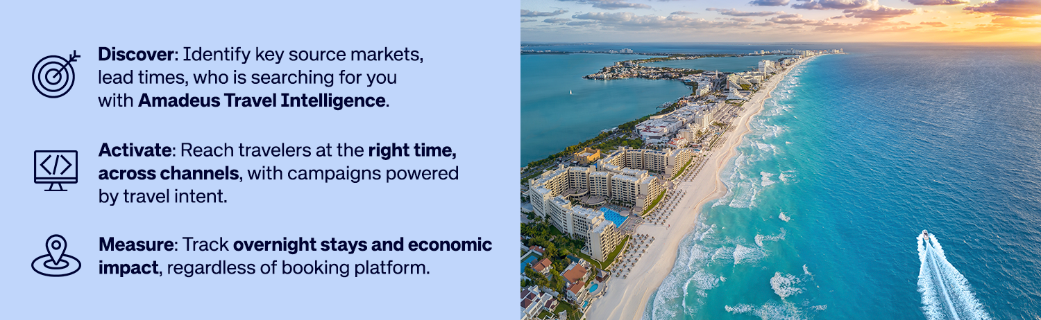 Plan your place campaign with our in-house digital marketing experts. Powered by Amadeus audiences and measured in ROAS based on in-destination arrivals.