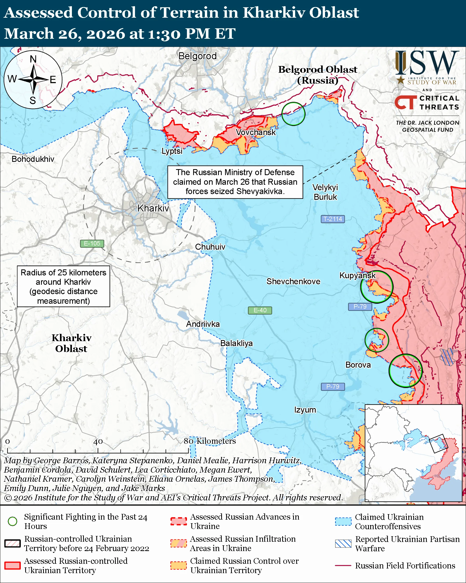 Unconfirmed claims: The Russian Ministry of Defense (MoD) claimed on March 26 that elements of the Russian 83rd Motorized Rifle Regiment (69th Motorized Rifle Division, 6th CAA) seized Shevyakivka (northeast of Velykyi Burluk).[39]