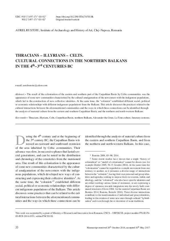 A. Rustoiu, A. Ursuţiu, Celtic Colonization in Banat. Comments Re- garding the Funerary Discoveries. In: V. Sîrbu, R. Ştefănescu (eds). The Thracians and their Neighbours in the Bronze and Iron Ages. Proceedings of the 12 th International Congress of Thracology. Târgovişte 10 th -14 th Sep- tember 2013. "Necropolises, Cult Places, Religion, Mythology", Volume II (Braşov 2013) 323-345.