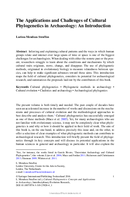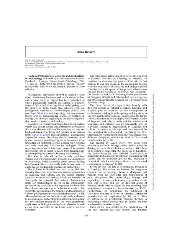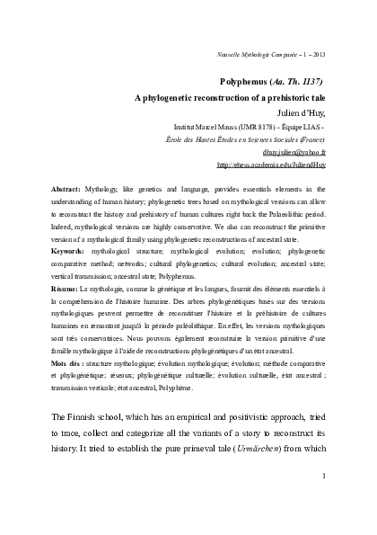 Devlet, E. G. and M. A. Devlet 2005. Myths in stone. World of rock art in Russia (in Russian). Aletheia, Moscow.Henn, B. M., C. Gignoux, A. A. Lin, P. J. Oefner, P. Shen, R. Scozzari, F. Cruciani, S. A. Tishkoff, J. L. Mountain and P. A. Underhill 2008. Y-chromosomal evidence of a pastoralist migration through Tanzania to southern Africa. PNAS 105(31): 10693-10698.d'Huy, J. 2009. New evidence for a closeness between the Abu Ra's shelter (eastern Sahara) and Egyptian beliefs. Sahara 20: 125-126.d'Huy, J. 2011a. Le récit du 'Chasseur adroit': un mythe Kabyle à remonter le temps? Almogaren 42: 37-42.d'Huy, J. 2011b. Le mythe ovidien de Pygmalion trouverait l'une de ses origines dans la Berbérie préhistorique. Les Cahiers de l'AARS 15: 19-26.d'Huy, J. 2012a. Le motif de Pygmalion: origine afrasienne et diffusion en Afrique. Sahara 23: 49-58.d'Huy, J. 2012b. Mythes, langues et génétique. Mythologie française 247: 25-26.d'Huy, J. 2012c. Le conte-type de Polyphème: essai de reconstitution phylogénétique. Mythologie française 248: 47-59.d'Huy, J. in prep. Un ours dans les étoiles: recherche phylo- génétique sur un mythe préhistorique. Préhistoire du Sud-Ouest.d'Huy, J. and J.-L. Le Quellec 2009. Du Sahara au Nil: la faible représentation d'animaux dangereux dans l'art rupestre du Sahara oriental pourrait être liée à la crainte de leur animation. Les Cahiers de l'AARS 13: 85-98.Le Quellec, J.-L. 2004. Rock art in Africa: mythology and legend. Flammarion, Paris.Le Quellec, J.-L. 2012. Iconoclasties rupestres au Sahara. Sahara 23: 59-74.Le Quellec, J.-L., P. de Flers and P. de Flers 2005. Du Sahara au Nil. Peintures et gravures d'avant les Pharaons. Collège de France / Fayard / Soleb, Paris.Lévi-Strauss, C. 1983. How myths die? In Structural anthro- pology, vol. 2, pp. 257-268. The University of Chicago Press, Chicago.Lycett, S. J., M. Collard and W. C. McGrew 2009. Cladistic analyses of behavioural variation in wild Pan troglodytes: exploring the chimpanzee culture hypothesis. Journal of Human Evolution 57: 337-349.Nunn, C. L. 2011. The comparative approach in evolutionary anthropology and biology. The University of Chicago Press, Chicago.Nunn, C. L., C. Arnold, L. Matthews and M. M. Borgerhoff 2010. Simulating trait evolution for cross-cultural com- parison. Philosophical Transactions of the Royal Society 365 (1559): 3807-3819.