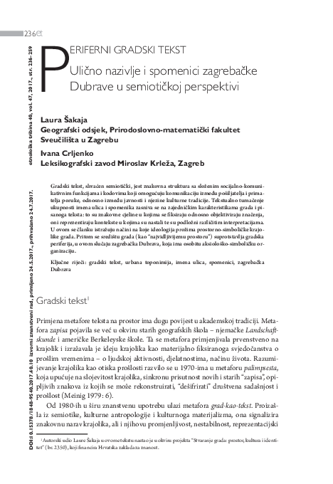 Periferni gradski tekst. Ulično nazivlje i spomenici zagrebačke Dubrave u semiotičkoj perspektivi