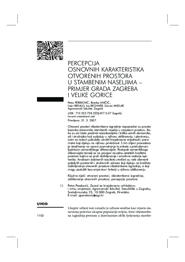 Percepcija Osnovnih Karakteristika Otvorenih Prostora U Stambenim Naseljima–Primjer Grada Zagreba I Velike Gorice (2007). …