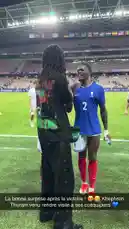 π A fan gets an unforgettable moment meeting members of the French national soccer team on the pitch after a game. Players like #2, #4, #6, #9, and #12 warmly shake hands, smile, and interact with the excited supporter, creating a heartwarming scene of sportsmanship under the stadium lights. by @equipedefrance with equipedefrance by Original Sound
