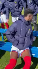 π The French national soccer team gathers for a light-hearted group photo session on a sunny day before their training. Players, dressed in blue jerseys and white shorts, laugh and pose together on a grassy field, creating a relaxed atmosphere. After the photos, they begin to remove their puffy jackets, revealing their full kits and preparing for the session ahead. by @equipedefrance with equipedefrance by Original Sound