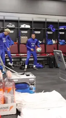 π A candid behind-the-scenes look at the French national soccer team players relaxing and having fun in the locker room before a match. Players in their blue training kits are seen laughing, dancing, and joking around, creating a relaxed and energetic atmosphere. by @equipedefrance with equipedefrance by Original Sound