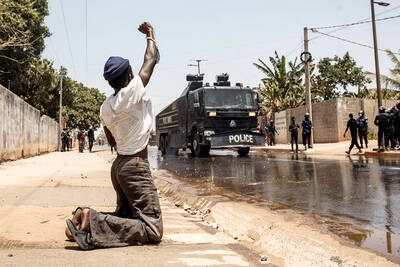A man kneels and gestures in Brufut, the Gambia, on Wednesday amid demonstrations calling for the release of Ousainou and Amie Bojang. Gambian police used tear gas and a water cannon in Brufut, where dozens of people protested to demand the release of the brother and sister. The Bojangs were acquitt