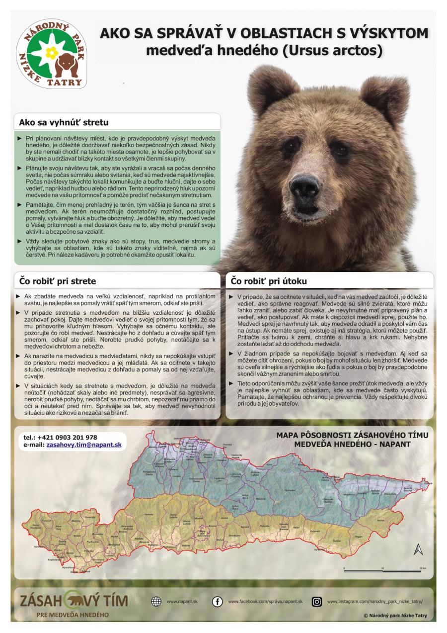Na informačnom plagáte Zásahového tímu medveďa hnedého NAPANT sú vyobrazené dôležité informácie, ako sa správať v prípade stretu s medveďom hnedým, aktuálne kontaktné údaje na Zásahový tím medveďa hnedého NAPANT (ZTMH NAPANT), ako aj mapka pôsobnosti zásahového tímu.Zverejnené 17.4.2025