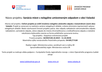 Hlavný cieľ projektu: Cieľom projektu je znížiť množstvo nelegálne uloženého odpadu v katastrálnom území obce Valaská. Projekt je zameraný na realizáciu sanácie nelegálnych skládok, vrátane eliminácie nepriaznivých vplyvov nelegálnych skládok. Typ projektu: Dopytovo-orientovaný projekt Trvanie projektu: 10/2019 (03.10.2019 – 11.10.2019) Maximálna výška nenávratného finančného príspevku: 54 659,77 EUR Riadiaci orgán: Ministerstvo práceZverejnené 26.6.2025