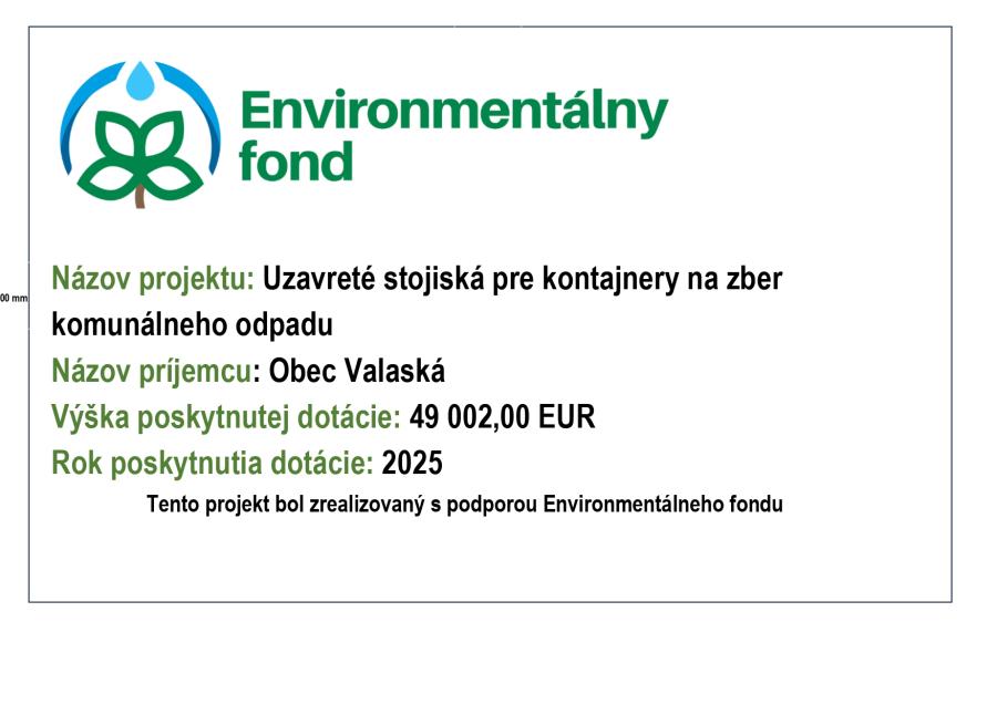 Názov projektu: Uzavreté stojiská pre kontajnery na zber komunálneho odpadu Názov príjemcu: Obec Valaská Výška poskytnutej dotácie: 49 002,00 EUR Rok poskytnutia dotácie: 2025 Tento projekt bol zrealizovaný s podporou Environmentálneho fonduZverejnené 14.1.2026