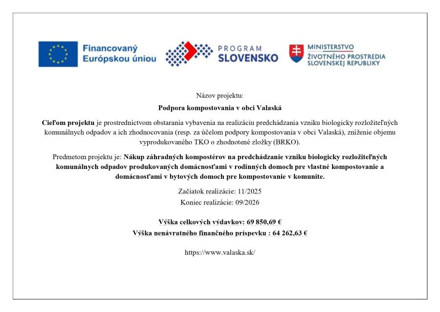 Názov projektu: Podpora kompostovania v obci Valaská Cieľom projektu je prostredníctvom obstarania vybavenia na realizáciu predchádzania vzniku biologicky rozložiteľných komunálnych odpadov a ich zhodnocovania (resp. za účelom podpory kompostovania v obci Valaská), zníženie objemu vyprodukovaného TKO o zhodnotené zložky (BRKO). Predmetom projektu je: Nákup záhradných kompostérov na predchádzanie vzniku biologicky rozložiteľných komunálnych odpZverejnené 15.1.2026