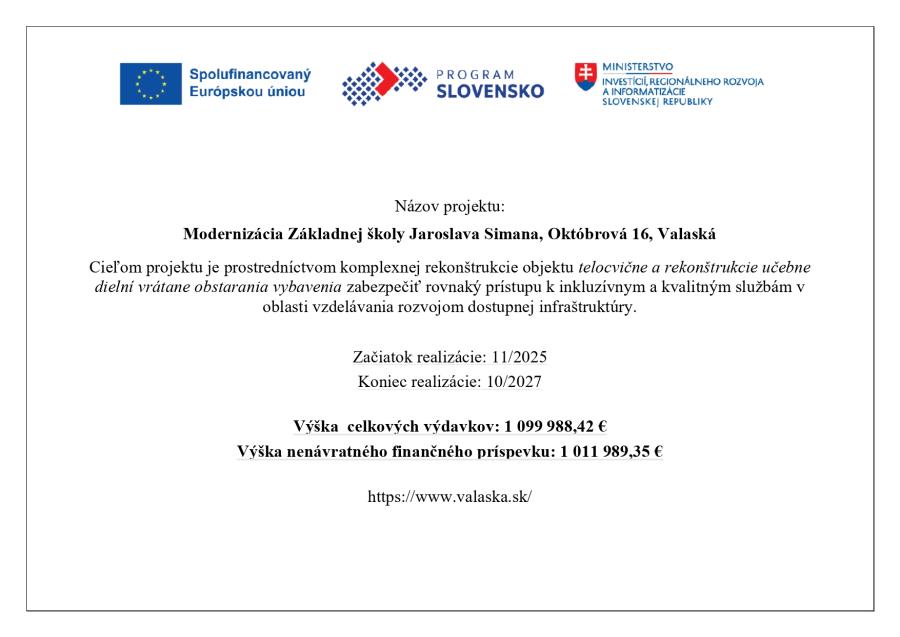 Názov projektu: Modernizácia Základnej školy Jaroslava Simana, Októbrová 16, Valaská Cieľom projektu je prostredníctvom komplexnej rekonštrukcie objektu telocvične a rekonštrukcie učebne dielní vrátane obstarania vybavenia zabezpečiť rovnaký prístupu k inkluzívnym a kvalitným službám v oblasti vzdelávania rozvojom dostupnej infraštruktúry. Začiatok realizácie: 11/2025 Koniec realizácie: 10/2027 Výška celkových výdavkov: 1 099 988,42 €Zverejnené 15.1.2026