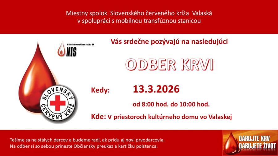 Miestny spolok Červeného kríža Valaská v spolupráci s mobilnou transfúznou stanicou Vás pozývajú na mobilný odber krvi, ktorý sa uskutoční v piatok, 13. marca 2026 v čase od 8:00 do 10:00 hod. v priestoroch kultúrneho domu.Zverejnené 9.3.2026