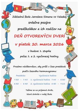 ZŠ J. Simana Valaská pozýva predškolákov a ich rodičov na Deň otvorených dverí, ktorý sa uskutoční dňa 20. marca 2026 v budove 1. stupňa.Zverejnené 16.3.2026