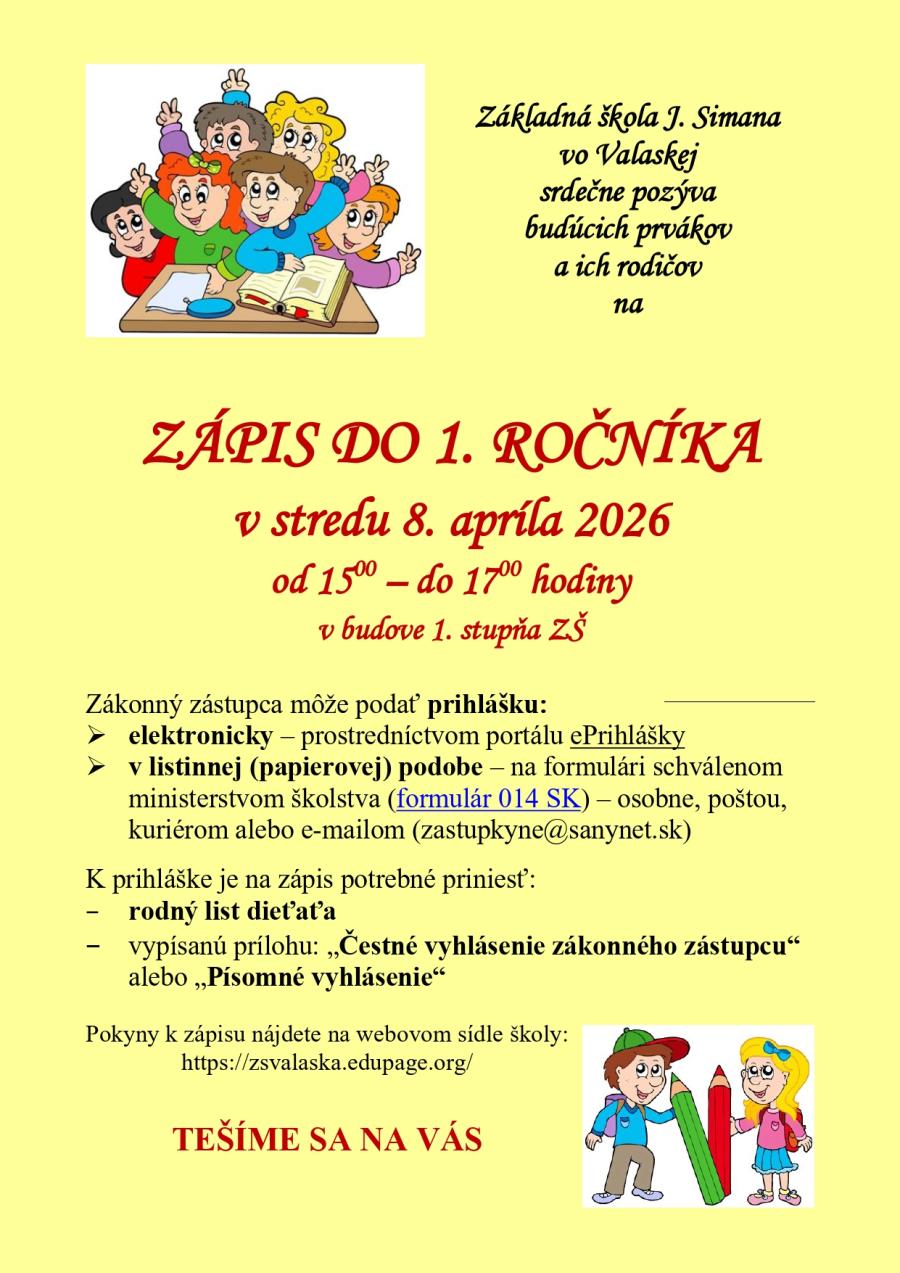 ZŠ J. Simana Valaská pozýva budúcich prvákov a ich rodičov na zápis do 1. ročníka, ktorý sa bude konať dňa 8. apríla 2026 od 15.00 do 17.00 hod v budove 1. stupňa.Zverejnené 16.3.2026