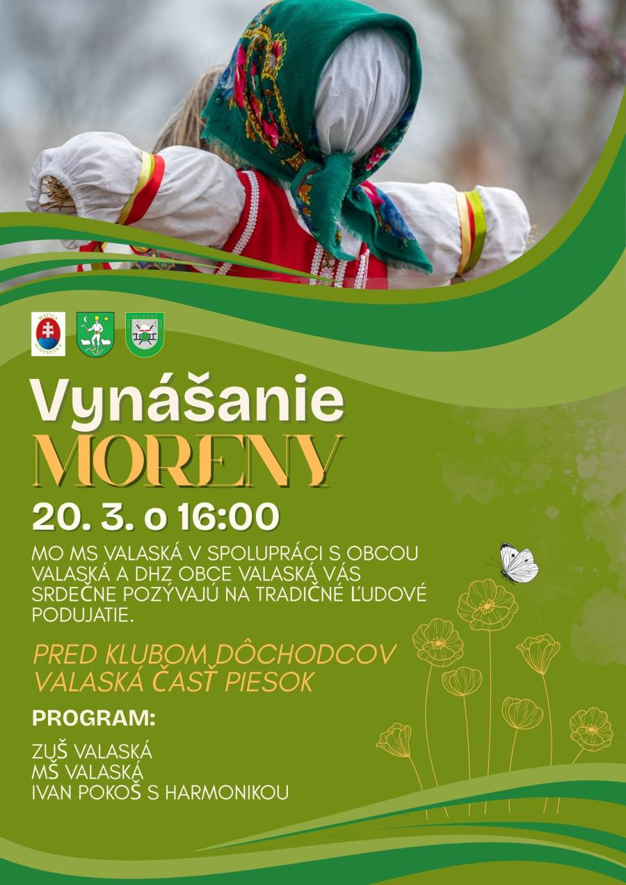 MO MS Valaská v spolupráci s obcou a DHZ Vás pizýva na vynášanie Moreny, ktoré sa uskutoční dňa 20. marca 2026 o 16.00 hod pred KD Piesok.Zverejnené 16.3.2026
