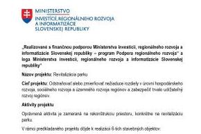 „Realizované s finančnou podporou Ministerstva investícií, regionálneho rozvoja a informatizácie Slovenskej republiky – program Podpora regionálneho rozvoja“ a loga Ministerstva investícií, regionálneho rozvoja a informatizácie Slovenskej republiky“ Názov projektu: Revitalizácia parku Cieľ projektu: Odstraňovať alebo zmierňovať nežiaduce rozdiely v úrovni hospodárskeho rozvoja, sociálneho rozvoja a územného rozvoja regiónov a zabezpečiť trvZverejnené 28.10.2025