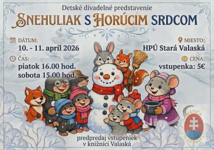 Ochotnícke divadlo MO MS Valaská si pre malé i veľké deti pripravilo divadelné predstavenie - Snehuliak s horúcim srdcom, ktoré sa uskutoční v dňoch 10. apríla o 16:00 hod a 11. apríla o 15:00 hod. v sále HPÚ. Vstupenky v cene 5€ si môžete zakúpiť v knižnici OcÚ.Zverejnené 31.3.2026