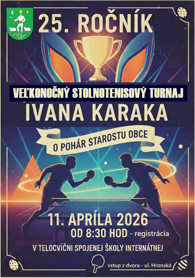 25. ročník Veľkonočného stolnotenisového turnaja Ivana Karaka, o pohár starostu obce. sobota, 11. apríl 2026 8:30 hod. - registrácia telocvičňa Spojenej školy internátnejZverejnené 2.4.2026