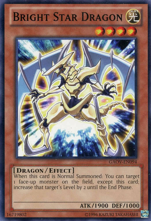 | Spanish | Dragón de la Estrella Brillante | Cuando esta carta es Invocada de Modo Normal: puedes seleccionar otro monstruo boca arriba en el Campo; incrementa en 2 el Nivel de ese objetivo hasta el final de este turno. |