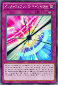 | Japanese | インターフェアレンス・キャンセラー | 自分フィールドの相互リンク状態のリンクモンスター1体を対象としてこのカードを発動できる。このカードの①の効果は1ターンに、対象のモンスターのリンクマーカーの数まで使用できる。①:自分がダメージを受ける相手の効果が発動した場合に発動する。その効果で自分が受けるダメージは0になる。②:このカードを発動したターンのエンドフェイズに発動する。このカードを自分の魔法&罠ゾーンにセットする。 |
