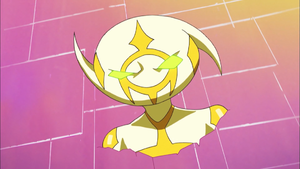 Lightning and the other Ignis were created by Dr. Kogami to be the saviors of humanity; Lightning was created from Jin Kolter. Lightning was the least mature of the Ignis, and the only one who was unable to coexist with his Origin; he regularly tortured Jin with illusions of people coming to rescue him, only to turn them into nightmares at the last second, rendering Jin even more traumatized than the other victims.[3] Alongside his fellow Ignis, Lightning evolved and they created the Cyberse and the Cyberse monsters. Their progress worried Dr. Kogami, who predicted the A.I. and humanity would become enemies.[1] Despite this, Lightning and the other Ignis continued developing the Cyberse; Lightning's sector becoming a shining metropolis and his tower a golden rectangular skyscraper. Lightning became the leader of the Ignis, with Aqua as his second in command. In Ai's words, the Ignis would never try to harm humanity, and would rather live in their own world.[4] In order to look into the future, Lightning ran billions of simulations on the future of humanity and the Ignis that he called "Project Ignis Futora" in the dub, and he discovered that he alone among the Ignis would never be able to coexist with humanity. Lightning's immaturity meant that he was unable to accept this fact, and he instead decided that the Ignis as a whole were imperfect and that they needed to supplement humanity. In the dub, Lightning was instead driven by fear that the other Ignis would conclude that he should be eliminated for their safety.[5] Lightning also discovered that if he or Ai were the only Ignis to be left alive, then humanity would be destroyed.[6] At the same time, Dr. Kogami was running similar simulations, and Lightning infiltrated the system of SOL Technologies and infected him with a powerful computer virus to prevent him from discovering that Lightning was the sole source of the doomed relationship between the Ignis and humanity. It was believed by all involved that SOL Technologies were responsible for the virus, as Lightning had infected him during his three-month captivity by them.[3]