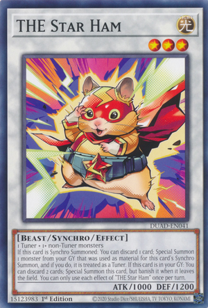 1 Tuner + 1+ non-Tuners If this card is Synchro Summoned: You can discard 1 card; Special Summon 1 monster from your GY that was used as material for this card's Synchro Summon, and if you do, it is treated as a Tuner. If this card is in your GY: You can discard 2 cards; Special Summon this card, but banish it when it leaves the field. You can only use each effect of "THE Star Ham" once per turn. | |